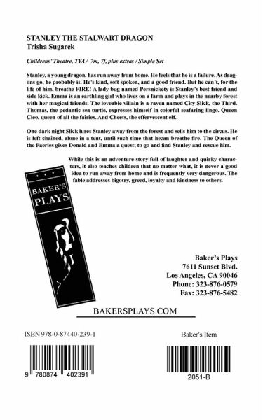 Childrens' Theatre, TYA / 7m, 7f, plus extras / Simple Set Stanley, a young dragon, has run away from home. He feels that he is a failure. As dragons go, he probably is. He's kind, soft spoken, and a good friend. But he can't, for the life of him, breathe FIRE! A lady bug named Persnickety is Stanley's best friend and side kick. Emma is an earthling girl who lives on a farm and plays in the nearby forest with her magical friends. The loveable villain is a raven named City Slick, the Third. Thom