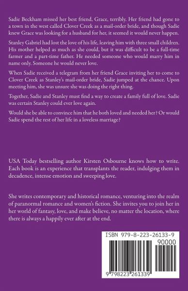 Sadie Beckham missed her best friend, Grace, terribly. Her friend had gone to a town in the west called Clover Creek as a mail-order bride, and though Sadie knew Grace was looking for a husband for her, it seemed it would never happen. Stanley Gabriel had lost the love of his life, leaving him with three small children. His mother helped as much as she could, but it was difficult to be a full-time farmer and a part-time father. He needed someone who would marry him in name only. Someone he would never love. When Sadie received a telegram from her friend Grace inviting her to come to Clover Creek as Stanley's mail-order bride, Sadie jumped at the chance. Upon meeting him, she was unsure she was doing the right thing. Together, Sadie and Stanley must find a way to create a family full of love. Sadie was certain Stanley could ever love again. Would she be able to convince him that he both loved and needed her? Or would Sadie spend the rest of her life in a loveless marriage?