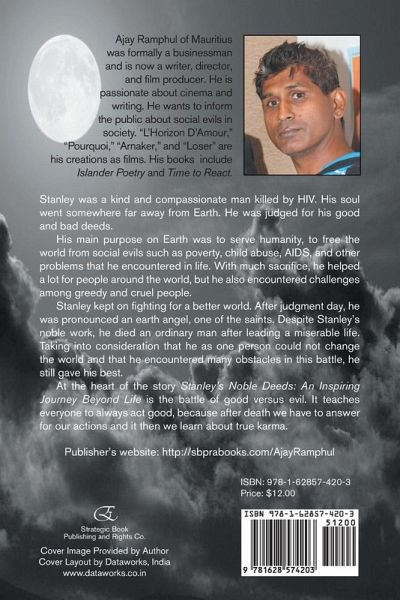 Stanley was a kind and compassionate man killed by HIV. His soul went somewhere far away from Earth. He was judged for his good and bad deeds.His main purpose on Earth was to serve humanity, to free the world from social evils such as poverty, child abuse, AIDS, and other problems that he encountered in life. With much sacrifice, he helped a lot for people around the world, but he also encountered challenges among greedy and cruel people.Stanley kept on fighting for a better world. After judgment day, he was pronounced an earth angel, one of the saints. Despite Stanley's noble work, he died an ordinary man after leading a miserable life. Taking into consideration that he as one person could not change the world and that he encountered many obstacles in this battle, he still gave his best.At the heart of the story Stanley's Noble Deeds: An Inspiring Journey Beyond Life is the battle of good versus evil. It teaches everyone to always act good, because after death we have to answer for our actions and it then we learn about true karma.
