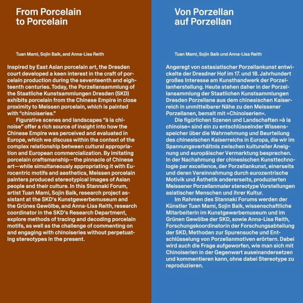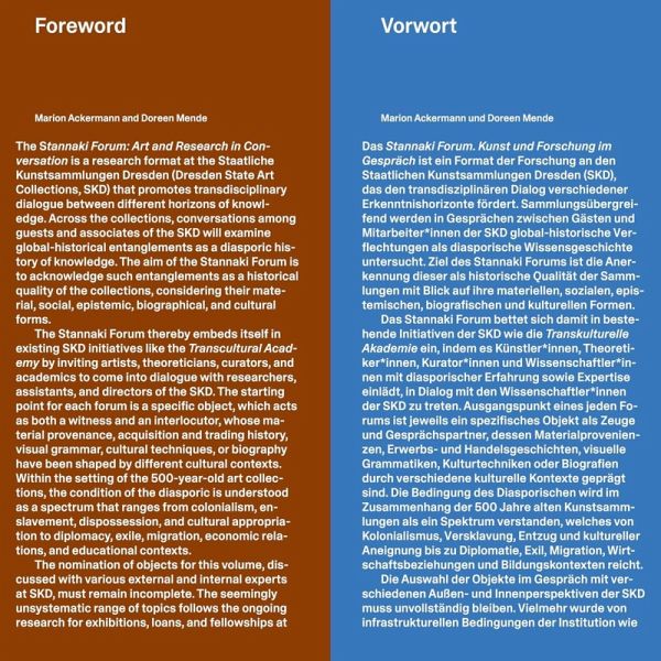Stannaki Forum is a research format that enables discursive exchange across different knowledge horizons. The focus is on a specific object that serves as both witness and interlocutor. The objects reflect contexts such as colonialism, enslavement, dispossession, and cultural appropriation, but also diplomacy, exile, migration, economic relations, and education. The Stannaki Forum aims to recognize these contextual entanglements and thus bring to life the diasporic histories of the 500-year-old State Collections.