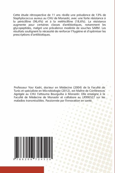 Cette étude rétrospective de 11 ans révèle une prévalence de 13% de Staphylococcus aureus au CHU de Monastir, avec une forte résistance à la pénicilline (96,4%) et à la méthicilline (18,6%). La résistance augmente pour certaines classes d'antibiotiques, notamment les glycopeptides, malgré une prévalence modérée de souches SARM. Les résultats soulignent la nécessité de renforcer l'hygiène et d'optimiser les prescriptions d'antibiotiques.