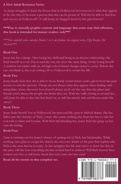 A New Adult Romance Series As Jenny struggles to learn the lesson that in Hollywood not everyone is what they appear to be, she tries to become a person that she can be proud of. Will she be able to find love and success in Hollywood? Or will Jenny be dragged down by her past forever? ***Due to sexually graphic content and language that some may find offensive, this book is intended for mature readers only*** ***This complete series contains Books 1 to 4 and follows the original series, Fifty Recipes For Disaster*** Book One Jenny has hit a slump. After losing her child and being in an abusive relationship, she finds herself in a rut. Day in and day out, she does the same thing, slowly losing herself. A random encounter with an old high school friend changes Jenny's course. Before she can overthink it, she is jet setting off to Hollywood to restart her life. Book Two Jenny finally feels that she is able to focus firmly on her future until a ghost from her past returns to ruin her present. Things are not always what they appear when dealing with rising fame. Jenny discovers love doesn't always work out the way that she plans and friends aren't always the people she thinks they are. With the walls closing in around her, will Jenny be able to face the fear head on, or will she merely sink and drown under the waves? Book Three Jenny finds herself lost in Hollywood, her personal life open to tabloid drama. She has fallen into the clutches of Rich, a man who wants nothing else from her but to ride her coat tails to fame and fortune. With Rich blackmailing her, Jenny feels her grasp on her own life fading. Book Four Time is running out for Jenny's chance of getting rid of Rich, her blackmailer. While working out a plan to escape his clutch, she uncovers details of his past that explain why Rich is the man that he is today. As she navigates her life and strives to leave her fear in the past, will she lose everything she has worked hard to achieve? Will Rich forever have control over her or will Jenny break free and come into her own? Read all the stories in this complete set.