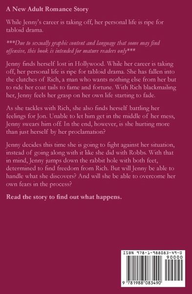 A New Adult Romance Story While Jenny's career is taking off, her personal life is ripe for tabloid drama. ***Due to sexually graphic content and language that some may find offensive, this book is intended for mature readers only*** Jenny finds herself lost in Hollywood. While her career is taking off, her personal life is ripe for tabloid drama. She has fallen into the clutches of Rich, a man who wants nothing else from her but to ride her coat tails to fame and fortune. With Rich blackmailing her, Jenny feels her grasp on her own life starting to fade. As she tackles with Rich, she also finds herself battling her feelings for Jon. Unable to let him get in the middle of her mess, Jenny swears him off. In the end, however, is she hurting more than just herself by her proclamation? Jenny decides this time she is going to fight against her situation, instead of going along with it like she did with Robbs. With that in mind, Jenny jumps down the rabbit hole with both feet, determined to find freedom from Rich. But will Jenny be able to handle what she discovers? And will she be able to overcome her own fears in the process? Read the story to find out what happens.
