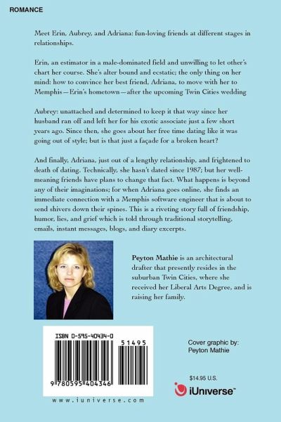 Meet Erin, Aubrey, and Adriana: fun-loving friends at different stages in relationships. Erin, an estimator in a male-dominated field and unwilling to let other's chart her course. She's alter bound and ecstatic; the only thing on her mind: how to convince her best friend, Adriana, to move with her to Memphis-Erin's hometown-after the upcoming Twin Cities wedding Aubrey: unattached and determined to keep it that way since her husband ran off and left her for his exotic associate just a few short years ago. Since then, she goes about her free time dating like it was going out of style; but is that just a façade for a broken heart? And finally, Adriana, just out of a lengthy relationship, and frightened to death of dating. Technically, she hasn't dated since 1987; but her well-meaning friends have plans to change that fact. What happens is beyond any of their imaginations; for when Adriana goes online, she finds an immediate connection with a Memphis software engineer that is about to send shivers down their spines. This is a riveting story full of friendship, humor, lies, and grief which is told through traditional storytelling, emails, instant messages, blogs, and diary excerpts.