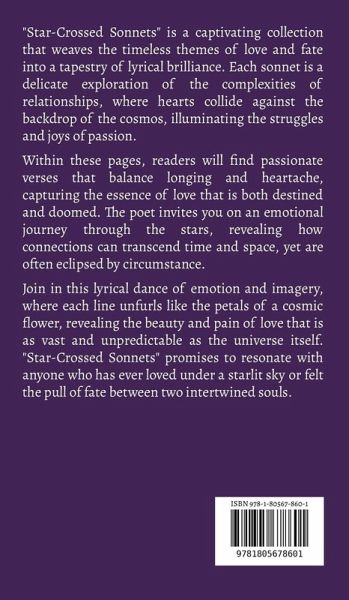 "Star-Crossed Sonnets" is a captivating collection that weaves the timeless themes of love and fate into a tapestry of lyrical brilliance. Each sonnet is a delicate exploration of the complexities of relationships, where hearts collide against the backdrop of the cosmos, illuminating the struggles and joys of passion. Within these pages, readers will find passionate verses that balance longing and heartache, capturing the essence of love that is both destined and doomed. The poet invites you on an emotional journey through the stars, revealing how connections can transcend time and space, yet are often eclipsed by circumstance. Join in this lyrical dance of emotion and imagery, where each line unfurls like the petals of a cosmic flower, revealing the beauty and pain of love that is as vast and unpredictable as the universe itself. "Star-Crossed Sonnets" promises to resonate with anyone who has ever loved under a starlit sky or felt the pull of fate between two intertwined souls.