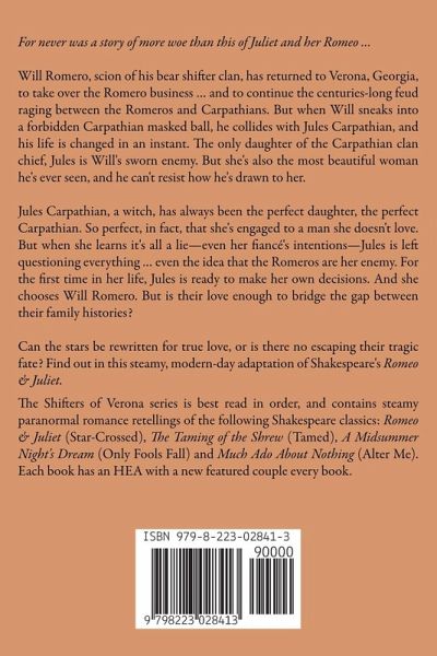 For never was a story of more woe than this of Juliet and her Romeo … Will Romero, scion of his bear shifter clan, has returned to Verona, Georgia, to take over the Romero business … and to continue the centuries-long feud raging between the Romeros and Carpathians. But when Will sneaks into a forbidden Carpathian masked ball, he collides with Jules Carpathian, and his life is changed in an instant. The only daughter of the Carpathian clan chief, Jules is Will's sworn enemy. But she's also the most beautiful woman he's ever seen, and he can't resist how he's drawn to her. Jules Carpathian, a witch, has always been the perfect daughter, the perfect Carpathian. So perfect, in fact, that she's engaged to a man she doesn't love. But when she learns it's all a lie—even her fiancé's intentions—Jules is left questioning everything … even the idea that the Romeros are her enemy. For the first time in her life, Jules is ready to make her own decisions. And she chooses Will Romero. But is their love enough to bridge the gap between their family histories? Can the stars be rewritten for true love, or is there no escaping their tragic fate? Find out in this steamy, modern-day adaptation of Shakespeare's Romeo & Juliet. The Shifters of Verona series is best read in order, and contains steamy paranormal romance retellings of the following Shakespeare classics: Romeo & Juliet (Star-Crossed), The Taming of the Shrew (Tamed), A Midsummer Night's Dream (Only Fools Fall) and Much Ado About Nothing (Alter Me). Each book has an HEA with a new featured couple every book.
