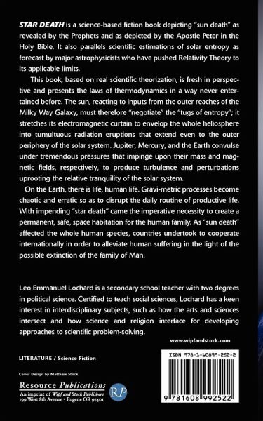Star Death is a science-based fiction book depicting ""sun death"" as revealed by the Prophets and as depicted by the Apostle Peter in the Holy Bible. It also parallels scientific estimations of solar entropy as forecast by major astrophysicists who have pushed Relativity Theory to its applicable limits. This book, based on real scientific theorization, is fresh in perspective and presents the laws of thermodynamics in a way never entertained before. The sun, reacting to inputs from the outer reaches of the Milky Way Galaxy, must therefore ""negotiate"" the ""tugs of entropy""; it stretches its electromagnetic curtain to envelop the whole heliosphere into tumultuous radiation eruptions that extend even to the outer periphery of the solar system. Jupiter, Mercury, and the Earth convulse under tremendous pressures that impinge upon their mass and magnetic fields, respectively, to produce turbulence and perturbations uprooting the relative tranquility of the solar system. On the Earth, there is life, human life. Gravi-metric processes become chaotic and erratic so as to disrupt the daily routine of productive life. With impending ""star death"" came the imperative necessity to create a permanent, safe, space habitation for the human family. As ""sun death"" affected the whole human species, countries undertook to cooperate internationally in order to alleviate human suffering in the light of the possible extinction of the family of Man.
