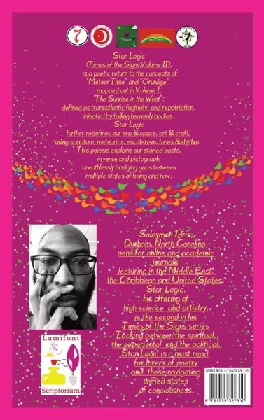 "Star Logic" (Times of the Signs,Volume II), is a poetic return to the concepts of "Meteor Time" and "Orunáge",mapped out in Volume I, "The Sunrise in the West": defined as transatlantic fugitivity and repatriation, initiated by the fall(s) of heavenly bodies. Solayman Idris, Durham, North Carolina, pens for online and academic journals; lecturing in the Middle East, the Caribbean and United States. Star Logic, his offering of high science and artistry, is the second in his Times of the Signs series. Tacking between the spiritual, the material, and the experiential, Star Logic is a must read for lovers of poetry and those navigating unified states of conciousness. A collection of dense essays, lofty poetry and primativist art; Star Logic" further redefines our era & space, art & craft; using scripture, meteorics, escoterism, tones & rhythm. This poiesis explains our storied pasts in verse and pictograph; breathlessly bridging gaps between multiple states of being and now.