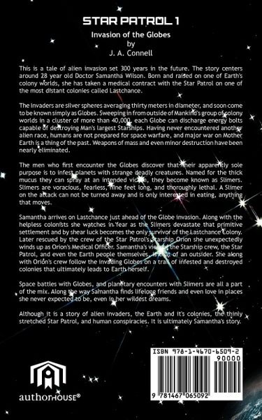 STAR PATROL 1 © Invasion of the Globes by J. A. Connell This is a tale of alien invasion set 300 years in the future. The story centers around 28 year old Doctor Samantha Wilson. Born and raised on one of Earth's colony worlds, she has taken a medical contract with the Star Patrol on one of the most distant colonies called Lastchance. The Invaders are silver spheres averaging thirty meters in diameter, and soon come to be known simply as Globes. Sweeping in from outside of Mankind's group of colony worlds in a cluster of more than 40,000, each Globe can discharge energy bolts capable of destroying Man's largest Starships. Having never encountered another alien race, humans are not prepared for space warfare, and major war on Mother Earth is a thing of the past. Weapons of mass and even minor destruction have been nearly eliminated. The men who first encounter the Globes discover that their apparently sole purpose is to infest planets with strange deadly creatures. Named for the thick mucus they can spray at an intended victim, they become known as Slimers. Slimers are voracious, fearless, nine feet long, and thoroughly lethal. A Slimer on the attack can not be turned away and is only interested in eating, anything that moves. Samantha arrives on Lastchance just ahead of the Globe invasion. Along with the helpless colonists she watches in fear as the Slimers devastate that primitive settlement and by shear luck becomes the only survivor of the Lastchance Colony. Later rescued by the crew of the Star Patrol's Starship Orion she unexpectedly winds up as Orion's Medical Officer. Samantha's view of the Starship crew, the Star Patrol, and even the Earth people themselves, is that of an outsider. She along with Orion's crew follow the invading Globes on a trail of infested and destroyed colonies that ultimately leads to Earth herself. Space battles with Globes, and planetary encounters with Slimers are all a part of the mix. Along the way Samantha finds lifelong friends and even love in places she never expected to be, even in her wildest dreams. Although it is a story of alien invaders, the Earth and it's colonies, the thinly stretched Star Patrol, and human conspiracies. It is ultimately Samantha's story.