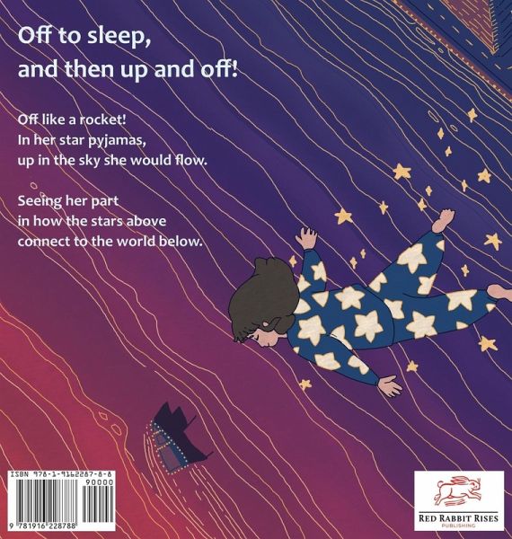 Off to sleep, and then up and off!! Off like a rocket! In her star pyjamas, up in the sky she would flow. Seeing her part in how the stars above connect to the world below. Star Pyjamas tells of the places that a young girl gets to go and shows the things she gets to see when floating above the world, asleep in her star pyjamas.