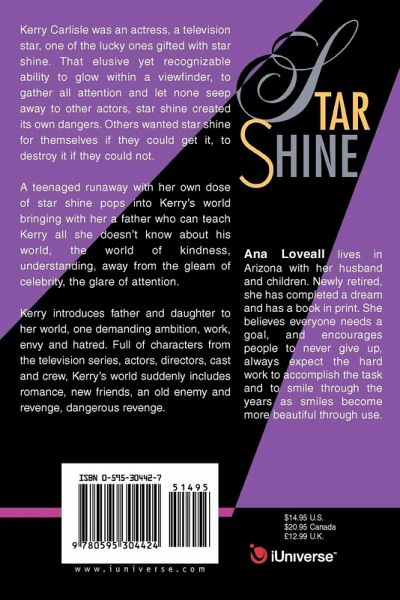 Kerry Carlisle was an actress, a television star, one of the lucky ones gifted with star shine. That elusive yet recognizable ability to glow within a viewfinder, to gather all attention and let none seep away to other actors, star shine created its own dangers. Others wanted star shine for themselves if they could get it, to destroy it if they could not. A teenaged runaway with her own dose of star shine pops into Kerry's world bringing with her a father who can teach Kerry all she doesn't know about his world, the world of kindness, understanding, away from the gleam of celebrity, the glare of attention. Kerry introduces father and daughter to her world, one demanding ambition, work, envy and hatred. Full of characters from the television series, actors, directors, cast and crew, Kerry's world suddenly includes romance, new friends, an old enemy and revenge, dangerous revenge.