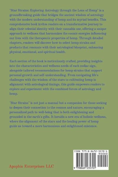 "Star Strains: Exploring Astrology through the Lens of Hemp" is a groundbreaking guide that bridges the ancient wisdom of astrology with the modern understanding of hemp and its myriad benefits. This comprehensive book invites readers on a transformative journey to align their celestial identity with their cannabis use, offering a unique approach to wellness that harmonizes the cosmic energies influencing our lives with the therapeutic properties of hemp. Through detailed chapters, readers will discover how to select hemp strains and products that resonate with their astrological blueprint, enhancing physical, emotional, and spiritual health. Each section of the book is meticulously crafted, providing insights into the characteristics and wellness needs of each zodiac sign, alongside tailored recommendations for hemp strains that support personal growth and self-understanding. From navigating life's challenges with the wisdom of the stars to cultivating hemp in alignment with astrological timings, this guide empowers readers to explore and experiment with the combined forces of astrology and hemp. "Star Strains" is not just a manual but a companion for those seeking to deepen their connection to the cosmos and nature, encouraging a personalized path to well-being that is both enlightening and grounded in the earth's gifts. It heralds a new era of holistic wellness, where the alignment of the stars and the healing power of hemp guide us toward a more harmonious and enlightened existence.