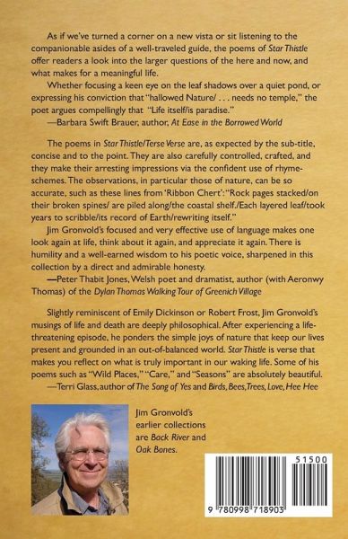 From tasting "wild sea/on a soft breeze" to expressing his conviction that "hallowed Nature/...needs no temple." the concise lyrical poems in Jim Gronvold's Star Thistle reflect his view that "Life itself/is paradise." His earlier collections are Back River and Oak Bones.