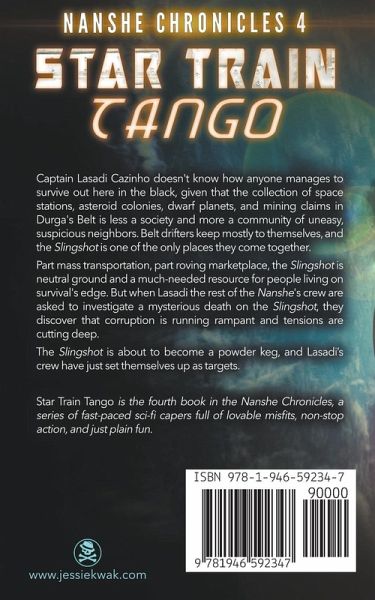 Lasadi doesn't know how anyone manages to survive out here in the black, given that the collection of space stations, asteroid colonies, dwarf planets, and mining claims in Durga's Belt is less a society and more a community of uneasy, suspicious neighbors. Belt drifters keep mostly to themselves, and the Slingshot is one of the only places they come together. Part mass transportation, part roving marketplace, the Slingshot is neutral ground and a much-needed resource for people living on survival's edge. But when Lasadi the rest of the Nanshe's crew are asked to investigate a mysterious death on the Slingshot, they discover that corruption is running rampant and tensions are cutting deep. The Slingshot is about to become a powder keg, and Lasadi's crew have just set themselves up as targets. Star Train Tango is the fourth book in the Nanshe Chronicles, a series of fast-paced sci-fi capers full of lovable misfits, non-stop action, and just plain fun. Perfect for fans of Cowboy Bebop, Firefly, and Leverage.
