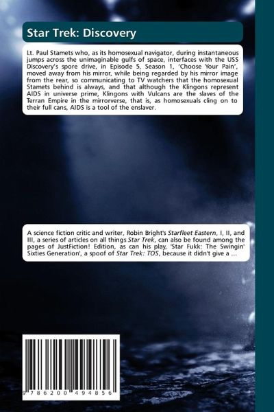 Lt. Paul Stamets who, as its homosexual navigator, during instantaneous jumps across the unimaginable gulfs of space, interfaces with the USS Discovery's spore drive, in Episode 5, Season 1, 'Choose Your Pain', moved away from his mirror, while being regarded by his mirror image from the rear, so communicating to TV watchers that the homosexual Stamets behind is always, and that although the Klingons represent AIDS in universe prime, Klingons with Vulcans are the slaves of the Terran Empire in the mirrorverse, that is, as homosexuals cling on to their full cans, AIDS is a tool of the enslaver.