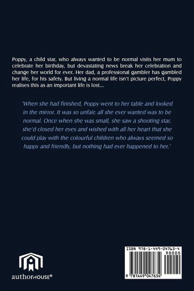 Poppy, a child star, who always wanted to be normal visits her mum to celebrate her birthday, but devastating news break her celebration and change her world for ever. Her dad, a professional gambler has gambled her life, for his safety. But living a normal life isn't picture perfect, Poppy realises this as an important life is lost... 'When she had finished, Poppy went to her table and looked in the mirror. It was so unfair; all she ever wanted was to be normal. Once when she was small, she saw a shooting star, she'd closed her eyes and wished with all her heart that she could play with the colourful children who always seemed so happy and friendly, but nothing had ever happened to her.'