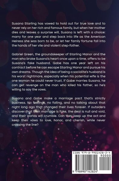 Susana Starling has vowed to hold out for true love and to never rely on her rich and famous family, but when her mother dies and leaves a surprise will, Susana is left with a choice: marry for one year and step back into life as the American Heiress she was born to be, or let her family fortune fall into the hands of her vile and violent step-father. Gabriel Green, the groundskeeper of Starling Manor and the man who broke Susana's heart once upon a time, offers to be Susana's fake husband. Gabe has one year left on his contract before he can escape Starling Manor and pursue his own dreams. Though the idea of being a socialite's husband is his worst nightmare, especially when his potential wife is the one woman he could never trust, if Gabe marries Susana, he can get revenge on the man who killed his father, so he's willing to say the vows. Susana and Gabe make a marriage pact that's strictly business. No feelings, no falling, and no talking about that night long ago that changed their lives forever. If outsiders discover that their marriage is fake, the deal is null and void, and their worlds will crumble. Can they keep up the act and keep their vows to love, honor, and cherish, while never crossing the line? Star Vows is the first book in a series of interconnected standalones following three millionaire cousins. If you love steamy billionaire, enemies to lovers, marriage of convenience, or fake dating romance, you'll love Star Vows.