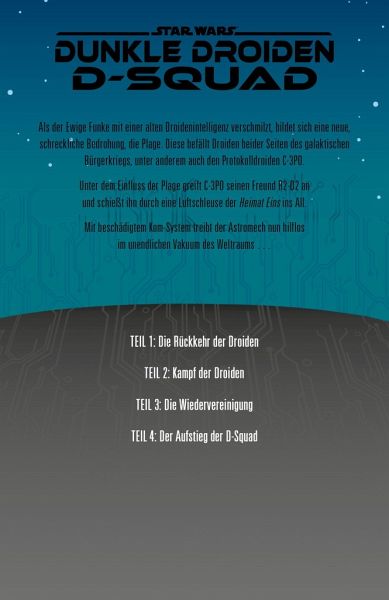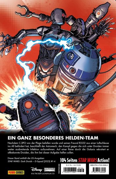 EIN GANZ B BESONDERES HELDEN-TEAM Nachdem C-3PO von der Plage befallen wurde und seinen Freund R2-D2 aus einer Luftschleuse ins All befördert hat, beschließt der Astromech, den Kampf gegen die sich unter Droiden immer weiter ausbreitende Infektion aufzunehmen. Auf einer Reise durch die Galaxis rekrutiert er altbekannte Droiden, die ihm bei dieser Aufgabe helfen sollen. Dieser Band enthält die US-Ausgaben STAR WARS: Dark Droids - D-Squad (2023) #1-4