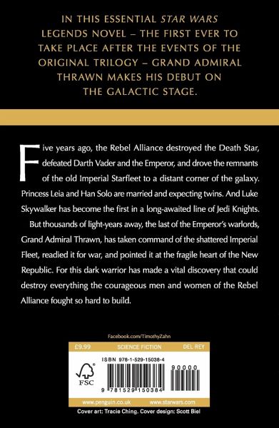 #1 NEW YORK TIMES BESTSELLER In this essential Star Wars Legends novel-the first ever to take place after the events of the original trilogy-Grand Admiral Thrawn makes his debut on the galactic stage. Five years ago, the Rebel Alliance destroyed the Death Star, defeated Darth Vader and the Emperor, and drove the remnants of the old Imperial Starfleet to a distant corner of the galaxy. Princess Leia and Han Solo are married and expecting twins. And Luke Skywalker has become the first in a long-awaited line of Jedi Knights. But thousands of light-years away, the last of the Emperor's warlords, Grand Admiral Thrawn, has taken command of the shattered Imperial fleet, readied it for war, and pointed it at the fragile heart of the New Republic. For this dark warrior has made a vital discovery that could destroy everything the courageous men and women of the Rebel Alliance fought so hard to build.