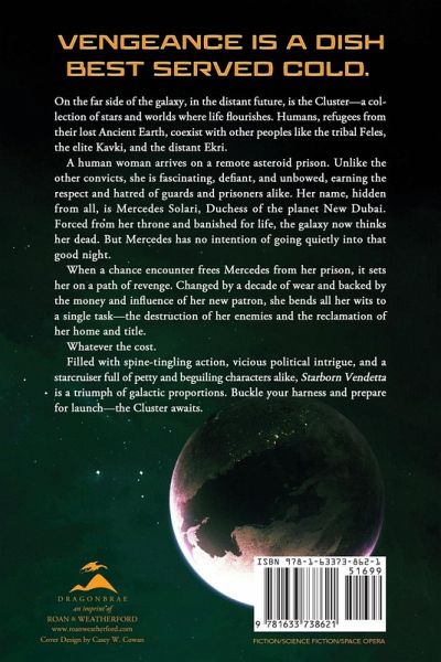 Vengeance is a dish best served cold. On the far side of the galaxy, in the distant future, is the Cluster-a collection of stars and worlds where life flourishes. Humans, refugees from their lost Ancient Earth, coexist with other peoples like the tribal Feles, the elite Kavki, and the distant Ekri. A human woman arrives on a remote asteroid prison. Unlike the other convicts, she is fascinating, defiant, and unbowed, earning the respect and hatred of guards and prisoners alike. Her name, hidden from all, is Mercedes Solari, Duchess of the planet New Dubai. Forced from her throne and banished for life, the galaxy now thinks her dead. But Mercedes has no intention of going quietly into that good night. When a chance encounter frees Mercedes from her prison, it sets her on a path of revenge. Changed by a decade of wear and backed by the money and influence of her new patron, she bends all her wits to a single task-the destruction of her enemies and the reclamation of her home and title. Whatever the cost. Filled with spine-tingling action, vicious political intrigue, and a starcruiser full of petty and beguiling characters alike, Starborn Vendetta is a triumph of galactic proportions. Buckle your harness and prepare for launch-the Cluster awaits.