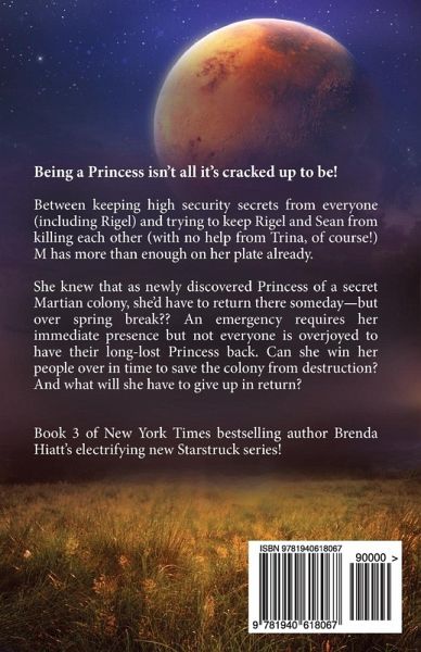 Being a Princess isn't all it's cracked up to be! Between keeping high security secrets from everyone (including Rigel) and trying to keep Rigel and Sean from killing each other (with no help from Trina, of course!) M has more than enough on her plate already. She knew that as newly discovered Princess of a secret Martian colony, she'd have to return there someday-but over spring break?? An emergency requires her immediate presence but not everyone is overjoyed to have their long-lost Princess back. Can she win her people over in time to save the colony from destruction? And what will she have to give up in return? Book 3 of New York Times bestselling author Brenda Hiatt's electrifying new Starstruck series!