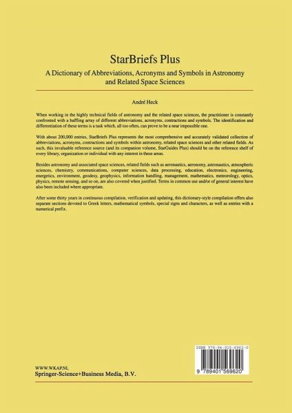 With about 200,000 entries, StarBriefs Plus represents the most comprehensive and accurately validated collection of abbreviations, acronyms, contractions and symbols within astronomy, related space sciences and other related fields. As such, this invaluable reference source (and its companion volume, StarGuides Plus) should be on the reference shelf of every library, organization or individual with any interest in these areas.