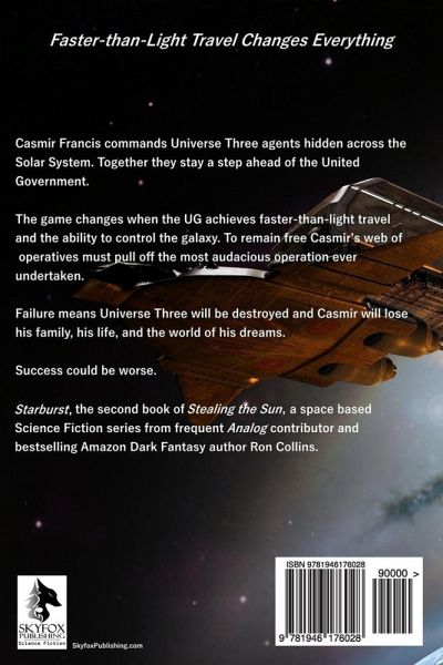 Faster-than-light travel changes everything Casmir Francis commands Universe Three agents hidden across the Solar System. Together they stay a step ahead of the United Government. The game changes when the UG achieves faster-than-light travel and the ability to control the galaxy. To remain free Casmir's web of operatives must pull off the most audacious operation ever undertaken. Failure means Universe Three will be destroyed and Casmir will lose his family, his life, and the world of his dreams. Success could be worse. Starburst, the second book of Stealing the Sun, a space based Science Fiction series from frequent Analog contributor and bestselling Amazon Dark Fantasy author Ron Collins. "Great characters I cared about, a kick-ass plot with surprising twists, great techie details, and a powerful story. Pick up Starburst. I guarantee you won't set it down until you've read every last word." Kristine Kathryn Rusch Hugo Award-winning author of the Diving Universe