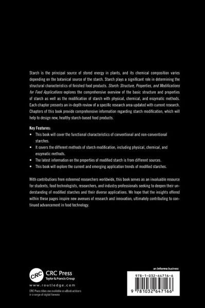 Key Features: This book will cover the functional characteristics of conventional and non-conventional starchesIt covers the different methods of starch modification, including physical, chemical, and enzymatic methodsThe latest information on the properties of modified starch is from different sourcesThis book will explore the current and emerging application trends of modified starches With contributions from esteemed researchers worldwide, this book serves as an invaluable resource for students, food technologists, researchers, and industry professionals seeking to deepen their understanding of modified starches and their diverse applications. We hope that the insights offered within these pages inspire new avenues of research and innovation, ultimately contributing to continued advancement in food technology.