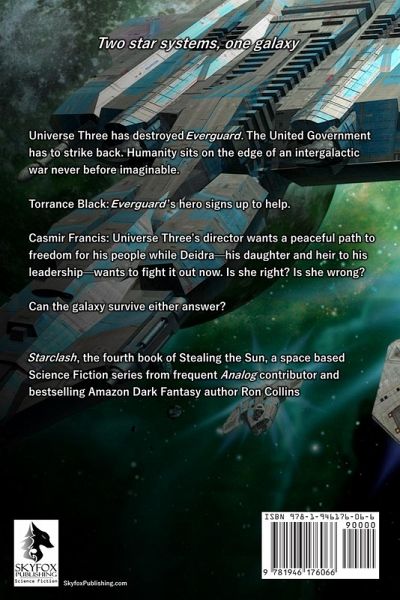 Two star systems, one galaxy Universe Three has destroyed Everguard. The United Government has to strike back. Humanity sits on the edge of an intergalactic war never before imaginable. Torrance Black: Everguard's hero signs up to help. Casmir Francis: Universe Three's director wants a peaceful path to freedom for his people while Deidra-his daughter and heir to his leadership-wants to fight it out now. Is she right? Is she wrong? Can the galaxy survive either answer? Starclash, the fourth book of Stealing the Sun, a space based Science Fiction series from frequent Analog contributor and bestselling Amazon Dark Fantasy author Ron Collins