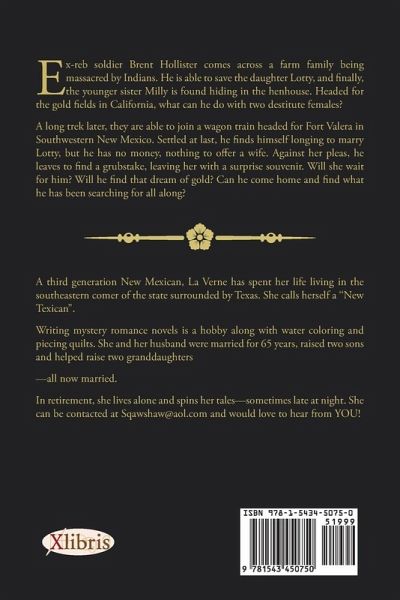 Ex-reb soldier Brent Hollister comes across a farm family being massacred by Indians. He is able to save the daughter Lotty, and finally, the younger sister Milly is found hiding in the henhouse. Headed for the gold fields in California, what can he do with two destitute females? A long trek later, they are able to join a wagon train headed for Fort Valera in Southwestern New Mexico. Settled at last, he finds himself longing to marry Lotty, but he has no money, nothing to offer a wife. Against her pleas, he leaves to find a grubstake, leaving her with a surprise souvenir. Will she wait for him? Will he find that dream of gold? Can he come home and find what he has been searching for all along?