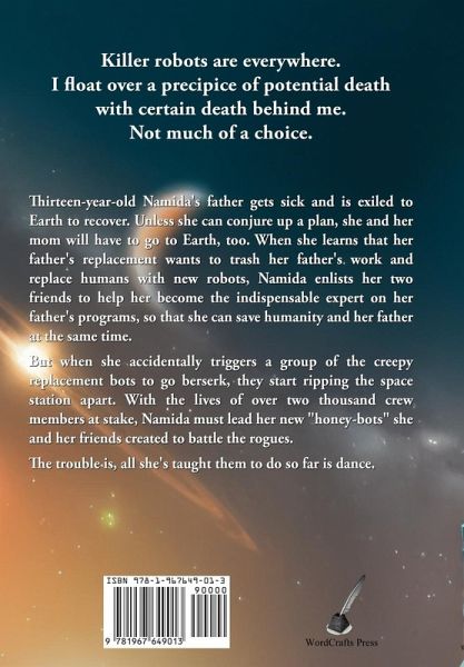 Thirteen-year-old Namida's father gets sick and is exiled to Earth to recover. Unless she can conjure up a plan, she and her mom will have to go to Earth, too. When she learns that her father's replacement wants to trash her father's work and replace humans with new robots, Namida enlists her two friends to help her become the indispensable expert on her father's programs, so that she can save humanity and her father at the same time. But when she accidentally triggers a group of the creepy replacement bots to go berserk, they start ripping the space station apart. With the lives of over two thousand crew members at stake, Namida must lead her new "honey-bots" she and her friends created to battle the rogues. The trouble is, all she's taught them to do so far is dance.