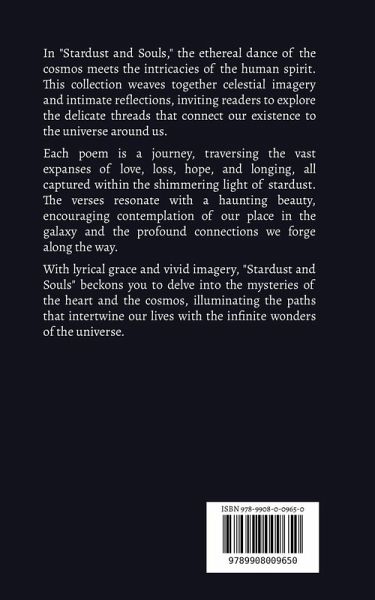 In "Stardust and Souls," the ethereal dance of the cosmos meets the intricacies of the human spirit. This collection weaves together celestial imagery and intimate reflections, inviting readers to explore the delicate threads that connect our existence to the universe around us. Each poem is a journey, traversing the vast expanses of love, loss, hope, and longing, all captured within the shimmering light of stardust. The verses resonate with a haunting beauty, encouraging contemplation of our place in the galaxy and the profound connections we forge along the way. With lyrical grace and vivid imagery, "Stardust and Souls" beckons you to delve into the mysteries of the heart and the cosmos, illuminating the paths that intertwine our lives with the infinite wonders of the universe.