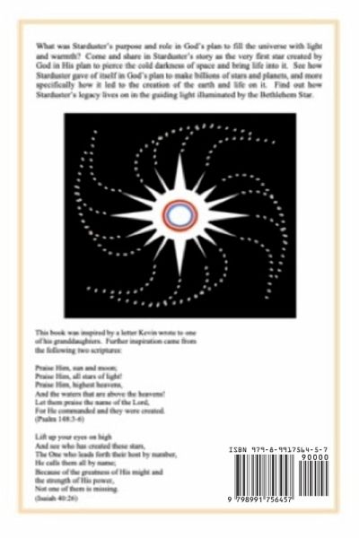 Starduster was a star. It was the first one created by God. At first, it was alone. It wondered about its purpose and role in God's plan to fill the universe with light and warmth. God continually assured Starduster that it would later understand, even though the star couldn't see what was in its future. At one point, Starduster gives of itself in God's plan to make billions of stars and planets, and more specifically how it led to the creation of the earth and life on it. Starduster's legacy lives on in the guiding light illuminated by the Bethlehem Star. This story was inspired by a letter Kevin wrote to his granddaughter.