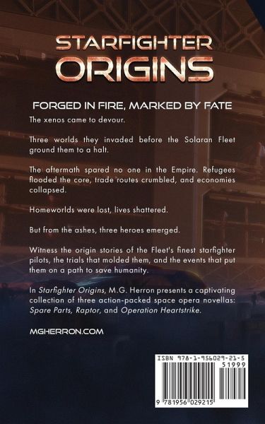 Forged in fire, marked by fate The xenos came to devour. Three worlds they invaded before the Solaran Fleet ground them to a halt. The aftermath spared no one in the Empire. Refugees flooded the core, trade routes crumbled, and economies collapsed. Homeworlds were lost, lives shattered. But from the ashes, three heroes emerged. Witness the origin stories of the Fleet's finest starfighter pilots, the trials that molded them, and the events that put them on a path to ultimately save humanity.In Starfighter Origins, M.G. Herron presents a captivating collection of three action-packed space opera novellas: Spare Parts, Raptor, and Operation Heartstrike. Fans of MG Herron's hit series, Relics of the Ancients, will enjoy familiar characters, while new readers get to savor three standalone space adventures that serve as the gateway to an epic and sprawling science fiction universe.