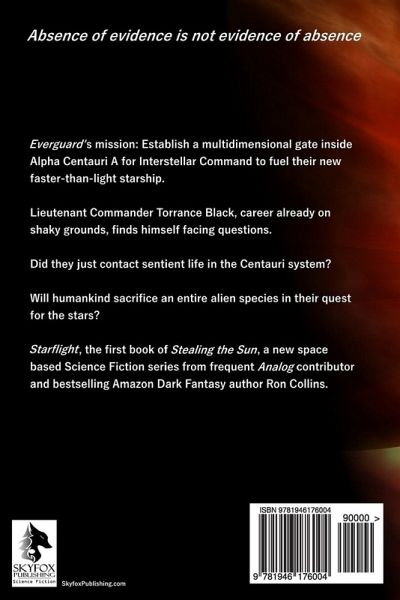"Ron Collins is one of our best hard science fiction writers-a novel from him is a major event. Enjoy!" Robert J. Sawyer Hugo Award-winning author of Quantum Night ----- Everguard's mission: Establish a multidimensional gate inside Alpha Centauri A for Interstellar Command to fuel their new faster-than-light starship. Lieutenant Commander Torrance Black, career already on shaky grounds, finds himself facing questions. Did they just contact sentient life in the Centauri system? Will humankind sacrifice an entire alien species in their quest for the stars? ---- STARFLIGHT, the first book of Stealing the Sun, a new Science Fiction series from frequent Analog contributor and bestselling Amazon Dark Fantasy author Ron Collins.