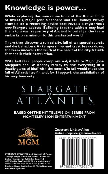 Knowledge is power... While exploring the unused sections of the Ancient city of Atlantis, Major John Sheppard and Dr. Rodney McKay stumble on a recording device that reveals a mysterious new Stargate address. Believing that the address may lead them to a vast repository of Ancient knowledge, the team embarks on a mission to this uncharted world. There they discover a ruined city, full of whispered secrets and dark shadows. As tempers fray and trust breaks down, the team uncovers the truth at the heart of the city. A truth that spells their destruction. With half their people compromised, it falls to Major John Sheppard and Dr. Rodney McKay to risk everything in a deadly game of bluff with the enemy. To fail would mean the fall of Atlantis itself - and, for Sheppard, the annihilation of his very humanity... Reliquary The spiral design in the center of the chamber floor was moving, becoming three-dimensional as the little metal tiles forming it shifted fluidly. The whole floor was still vibrating, making the glass and metal debris jump and dance. Something groaned again below their feet, and the spiral began to sink into the floor. Standing at John's elbow, McKay glared at Kavanagh, his mouth twisted in annoyance. "What did you do?" John wasn't thrilled either. "Some warning would have been nice, Doctor." Teyla and Ford watched the spiral uneasily, Kolesnikova a few steps behind them. Kavanagh shook his head, his eyes still on the metal sinking into the floor, his gaze rapt. "I wasn't sure it was really here, if the power source was still active. If I was...imagining it..." The groaning rumble of metal parts undisturbed for ages was growing louder, and John wasn't sure he had heard right. "What?" he said, having to raise his voice over the din. "Why did you think you were imagining it?" "I was imagining what?" Distracted, Rodney stepped sideways, moving along the edge of the shaft, craning his neck to watch the spiral's progress. "I wasn't talking to you," John shouted back, "I was-" "Wait." Rodney straightened up suddenly, looking at John. "It occurs to me that something may come out of here that could kill us." John swore and yelled, "Fall back, now!"