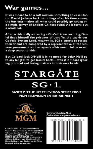 War games... It was meant to be a soft mission, something to ease Doctor Daniel Jackson back into things after his time among the Ancients - after all, what could possibly go wrong on a simple survey of ancient Chinese ruins? As it turns out, a whole lot. After accidentally activating a Goa'uld transport ring, Daniel finds himself the prisoner of Lord Yu, the capricious Goa'uld System Lord. Meanwhile, SG1's efforts to rescue their friend are hampered by a representative of the Chinese government with an agenda of his own to follow - and a deep secret to hide. But Colonel Jack O'Neill is in no mood for delay. He'll go to any lengths to get Daniel back - even if it means ignoring protocol and taking matters into his own hands. Four Dragons Unable to stand, unable to sit, Daniel hung from handcuffs latched to the top and side of a barely four-foot high cage. He tried to shift his weight, crouching in an awkward position that did little to stop the aches in his shoulders and thighs. He'd heard about cages like this one. Communist China allegedly used them to torture political prisoners. After a few days, the victim's legs would become swollen. In severe cases, necrosis can happen to feet, ankles and legs. Usually, the cages were set outdoors, exposing the prisoner to the elements. In Daniel's case, the cage was set just outside the door to Yu's throne room. So much for scoping out an escape route. He closed his eyes, exhausted. Other than a short nap in a cell on Yu's mothership, he hadn't slept in... Daniel wasn't sure how long it'd been. More importantly, he had no idea if Jack, Sam, or Teal'c had any idea where he was...