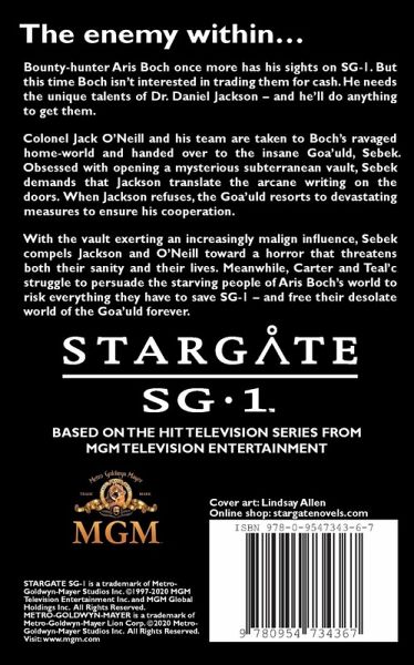 The enemy within... Bounty-hunter Aris Boch once more has his sights on SG-1. But this time Boch isn't interested in trading them for cash. He needs the unique talents of Dr. Daniel Jackson - and he'll do anything to get them. Colonel Jack O'Neill and his team are taken to Boch's ravaged home-world and handed over to the insane Goa'uld, Sebek. Obsessed with opening a mysterious subterranean vault, Sebek demands that Jackson translate the arcane writing on the doors.¿When Jackson refuses, the Goa'uld resorts to devastating measures to ensure his cooperation. With the vault exerting an increasingly malign influence, Sebek compels Jackson and O'Neill toward a horror that threatens both their sanity and their lives. Meanwhile, Carter and Teal'c struggle to persuade the starving people of Aris Boch's world to risk everything they have to save SG-1 - and free their desolate world of the Goa'uld forever. Siren Song Sebek moved toward Daniel with his easy predatory grace and stepped into his space, as if Daniel was a thing he owned. He was too close. If they made their move, and Daniel wasn't quick enough...Daniel was standing as straight and stiff as he could, trying to match Sebek's height; for a moment, neither moved. Teal'c's grip on Jack's arm tightened before his hand dropped away. As soon as the opportunity came, they were going to take it. "Your threats are meaningless," Sebek said, and waved at the Jaffa, who leveled their weapons at SG-1. "If your friends mean anything to you, your choice is simple." Daniel didn't look at any of them. His chin came up, and he pointed to the Ancient inscription. "Do you see this? Do you have the slightest understanding of what it means? It's a warning. It means whatever's in there is dangerous. A warning from the Ancients is incredibly rare." He leaned forward, nostrils flaring, gaze still locked with Sebek's, and said, "Only a very, very foolish person would ignore it. Whatever's in there is causing...this." Daniel swept one hand around in a circle, indicating all of them. "None of us are immune to its power." Sebek threw back his head and laughed with typical Goa'uld condescension. "Why should a warning from a long-dead race mean anything to us?" he said. He gripped Daniel by the neck, long fingers sliding around his throat like steel talons. "It is that power we must harness. So now you will choose, or we will choose for you."