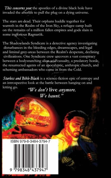 This concerns you: the apostles of a divine black hole have invaded the afterlife to pull the plug on a dying universe. The stars are dead. Their orphans huddle together for warmth in the Realm of the Iron Sky, a refugee camp built on the remains of a million fallen empires and gods slain in some inglorious Ragnarök. The Shadowlands Syndicate is a detective agency investigating disturbances in the bleeding edges, dreamscapes, and legal and liminal grey-areas between the Realm's desperate, declining civilizations. One Syndicate crew uncovers a vast conspiracy between a bodysnatching alien acid casualty, a predatory horde, the resurrected agents of an apocalyptic, anthropic church, and scheming ambassadors who came in from the Cold. Starless and Bible-Black is a science-fiction epic of entropy and an introspective look at the battle between hanging on and letting go.