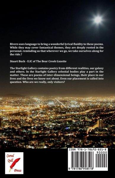 Rivers uses language to bring a wonderful lyrical fluidity to these poems. While they may cover fantastical themes, they are deeply rooted in the personal, reminding us that wherever we go, we take ourselves along for the ride.? Stuart Buck - E.IC of The Bear Creek Gazette The Starlight Gallery contains poetry from different realities, our galaxy and others. In the Starlight Gallery celestial bodies play a part in the matter. These are poems of inter-dimensional beings, their place in our lives and the lives we know not about. Even our placement is called into question. Who are we really, only visitors?