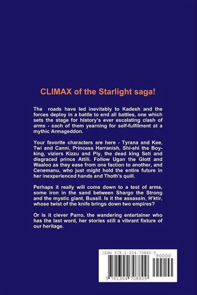 A classical confrontation between the armies of history's two most powerful empires. The characters of the previous four books are propelled into the intrigue, violence and death surrounding a legendary battle which is likely the creative mythic spark for all subsequent escalations. These lead like self-fulfilling prophecies to the Armageddon so many ardently desire today. But this story is about those long-ago warriors, princes and noble women who must fend off their own dark age. The options they have are grim. It is up to the Boy-king and his Nubian armies, a soon-to-be emperor of a collapsed realm and the peace-bride who has nothing to offer except her need for vengeance. Choosing sides, as they all must do, are the giants, Kee and Bussil, assassin H'ktir, Shargo the Strong, Twice-born Twi and Canni, the homeless priestess. Ugan the Glott and Waaloo slide like warm oils between the factions. But it is Parro, the far-sighted entertainer who spins herself into the creases of our psyches.