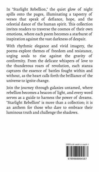 In "Starlight Rebellion," the quiet glow of night spills onto the pages, illuminating a tapestry of verses that speak of defiance, hope, and the celestial dance of the human spirit. This collection invites readers to traverse the cosmos of their own emotions, where each poem becomes a starburst of inspiration against the vast darkness of despair. With rhythmic elegance and vivid imagery, the poems explore themes of freedom and resistance, urging souls to rise against the gravity of conformity. From the delicate whispers of love to the thunderous roars of revolution, each stanza captures the essence of battles fought within and without, as the heart calls forth the brilliance of the universe to ignite change. Join the journey through galaxies untamed, where rebellion becomes a beacon of light, and every word serves as a guide to harness the power of dreams. "Starlight Rebellion" is more than a collection; it is an anthem for those who dare to embrace their luminous truth and challenge the shadows.