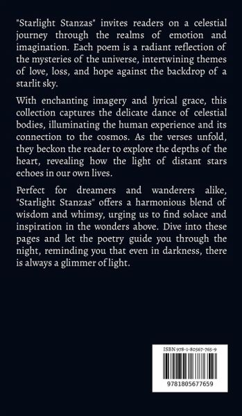 "Starlight Stanzas" invites readers on a celestial journey through the realms of emotion and imagination. Each poem is a radiant reflection of the mysteries of the universe, intertwining themes of love, loss, and hope against the backdrop of a starlit sky. With enchanting imagery and lyrical grace, this collection captures the delicate dance of celestial bodies, illuminating the human experience and its connection to the cosmos. As the verses unfold, they beckon the reader to explore the depths of the heart, revealing how the light of distant stars echoes in our own lives. Perfect for dreamers and wanderers alike, "Starlight Stanzas" offers a harmonious blend of wisdom and whimsy, urging us to find solace and inspiration in the wonders above. Dive into these pages and let the poetry guide you through the night, reminding you that even in darkness, there is always a glimmer of light.