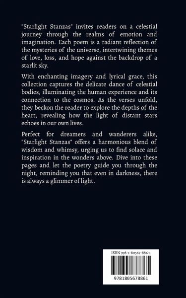 "Starlight Stanzas" invites readers on a celestial journey through the realms of emotion and imagination. Each poem is a radiant reflection of the mysteries of the universe, intertwining themes of love, loss, and hope against the backdrop of a starlit sky. With enchanting imagery and lyrical grace, this collection captures the delicate dance of celestial bodies, illuminating the human experience and its connection to the cosmos. As the verses unfold, they beckon the reader to explore the depths of the heart, revealing how the light of distant stars echoes in our own lives. Perfect for dreamers and wanderers alike, "Starlight Stanzas" offers a harmonious blend of wisdom and whimsy, urging us to find solace and inspiration in the wonders above. Dive into these pages and let the poetry guide you through the night, reminding you that even in darkness, there is always a glimmer of light.