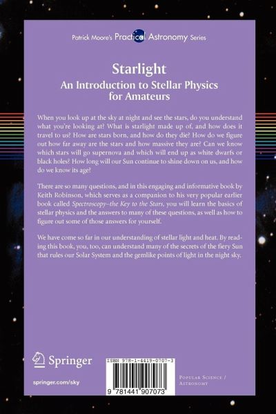 Starlight provides an in-depth study of stellar astrophysics that requires only basic high school mathematics and physics, making it accessible to all amateur astronomers. Starlight teaches amateur astronomers about the physics of stars and starlight in a friendly, easy-to-read way. The reader will take away a profoundly deeper understanding of this truly fascinating subject - and find his practical observations more rewarding and fulfilling as a result.