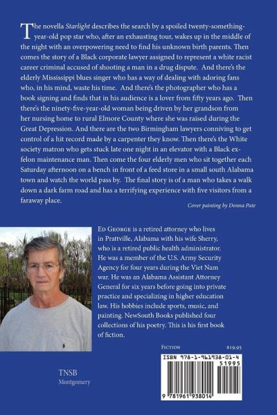 The novella Starlight describes the search by a spoiled twenty-something-year-old pop star who, after an exhausting tour, wakes up in the middle of the night with an overpowering need to find his unknown birth parents. Then comes the story of a Black corporate lawyer assigned to represent a white racist career criminal accused of shooting a man in a drug dispute. And there's the elderly Mississippi blues singer who has a way of dealing with adoring fans who, in his mind, waste his time. And there's the photographer who has a book signing and finds that in his audience is a lover from fifty years ago. Then there's the ninety-five-year-old woman being driven by her grandson from her nursing home to rural Elmore County where she was raised during the Great Depression. And there are the two Birmingham lawyers conniving to get control of a hit record made by a carpenter they know. Then there's the White society matron who gets stuck late one night in an elevator with a Black ex-felon maintenance man. Then come the four elderly men who sit together each Saturday afternoon on a bench in front of a feed store in a small south Alabama town and watch the world pass by. The final story is of a man who takes a walk down a dark farm road and has a terrifying experience with five visitors from a faraway place.
