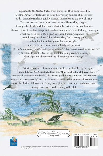Imported to the United States from Europe in 1890 and released in Central Park, New York City, to fight the growing number of insect pests at that time, the starlings quickly adapted themselves to the new climate. They are now at home almost everywhere. The starling is typical of many other birds, and this book with simple text is a wealth of birdlore. The marvel of streamline design and construction which is a bird's body-a design which has been copied to a great extent in building airplanes-is carefully explained. We follow the starling from nesting time, when the female busily sets the nest to rights, until the young ones are completely independent. As in "Pinto's Journey," "Turtles" and "Coyotes," also by Wilfrid Bronson and published by Sunstone Press, the text in this book for young readers is in large, clear type, and there are many illustrations on each page.