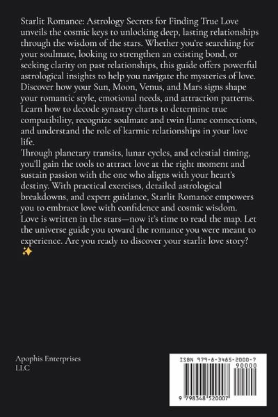 Starlit Romance: Astrology Secrets for Finding True Love unveils the cosmic keys to unlocking deep, lasting relationships through the wisdom of the stars. Whether you're searching for your soulmate, looking to strengthen an existing bond, or seeking clarity on past relationships, this guide offers powerful astrological insights to help you navigate the mysteries of love. Discover how your Sun, Moon, Venus, and Mars signs shape your romantic style, emotional needs, and attraction patterns. Learn how to decode synastry charts to determine true compatibility, recognize soulmate and twin flame connections, and understand the role of karmic relationships in your love life. Through planetary transits, lunar cycles, and celestial timing, you'll gain the tools to attract love at the right moment and sustain passion with the one who aligns with your heart's destiny. With practical exercises, detailed astrological breakdowns, and expert guidance, Starlit Romance empowers you to embrace love with confidence and cosmic wisdom. Love is written in the stars-now it's time to read the map. Let the universe guide you toward the romance you were meant to experience. Are you ready to discover your starlit love story? ✨