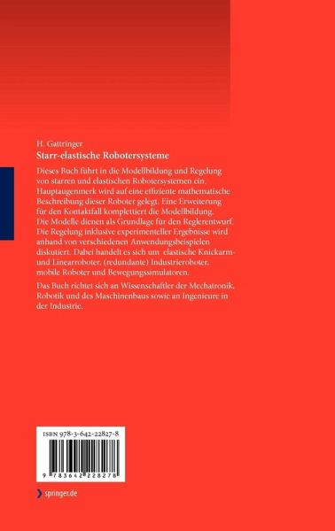 Einleitung.- Kinematik.- Dynamik.- Projektionsgleichung.- Elastische Systeme.- Ritz Verfahren.- Bindungen.- Elastische Knickarmroboter.- Elastische Linearroboter.- Industrieroboter.- Redundante modulare Roboter.- Fahrende Roboter.- Bewegungsplattformen.- Rotordynamik.- Anhang: A Kinematische Eigenschaften.- B Detaillierte Herleitung O(n)-Verfahren.- C Detaillierte Herleitung rekursive Kontaktmodellierung.- C Detaillierte Herleitung rekursive Stoßmodellierung.- E Hamilton Prinzip.- Rimoshenko Blaken.- Symbolverzeichnis.- Literatur.