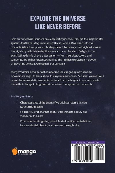 Explore the Brightest Stars in the Night Sky Explore the 25 brightest stars in the night sky and discover their unique characteristics, life cycles, and star categories, offering readers an in-depth understanding of astronomy objects and the universe. Delve into the captivating world of stars. This star gazing book takes you on a cosmic journey, unveiling the secrets of the brightest star in the sky and the fascinating star systems that have intrigued humanity for millennia. Dive deep into the fascinating details of each star system, including their size, color, temperature, distance from Earth, and the presence of exoplanets. Explore the universe like never before. Thanks to advanced observational astronomy, we can look further and more clearly than ever before. You'll discover unique and exceptional stars, from the largest star in the universe to variable stars that change brightness, and even a star composed of diamonds. From the majestic Sirius star system to distant constellations like Ursa Major, this book offers a detailed journey through these celestial wonders, making it an ideal astronomy gift or star gazing gift for kids. Inside, you’ll find: * A deep dive into the characteristics of the 25 brightest stars in the night sky. * Fundamental stargazing principles, teaching you how to identify constellations, locate celestial objects, and appreciate the night sky. * Insights into the life cycle and classification of stars, alongside fascinating examples of unique stars, such as the largest star in the universe and a star composed of diamonds, capturing the diverse nature of star categories. If you liked Star Finder!, National Geographic Stargazer's Atlas, or Space Explorers, you’ll love Starry Wonders.